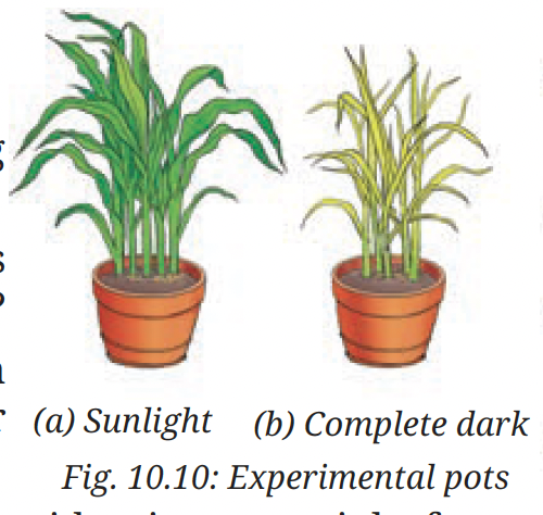 Q6. Krishna set up an experiment with two potted plants of same size and placed one of them in sunlight and the other in a dark room (Fig. 10.10).