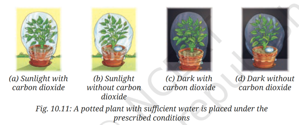 Q7. Vani believes that ‘carbon dioxide is essential for photosynthesis’. She sets up an experiment with plants under the following conditions (Fig. 10.11):